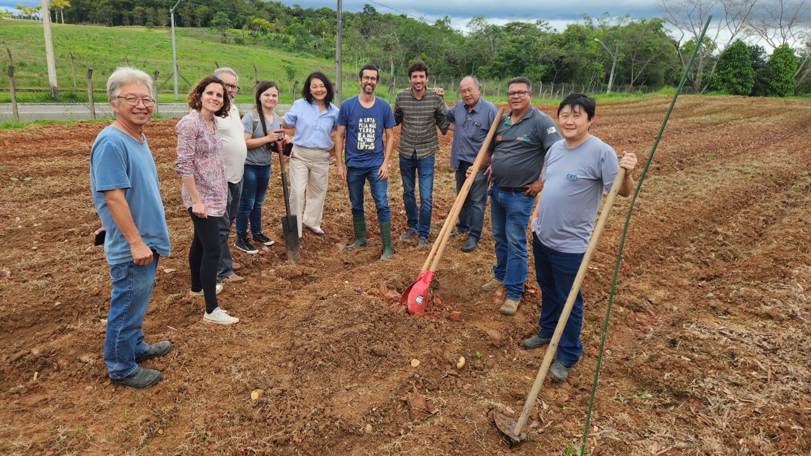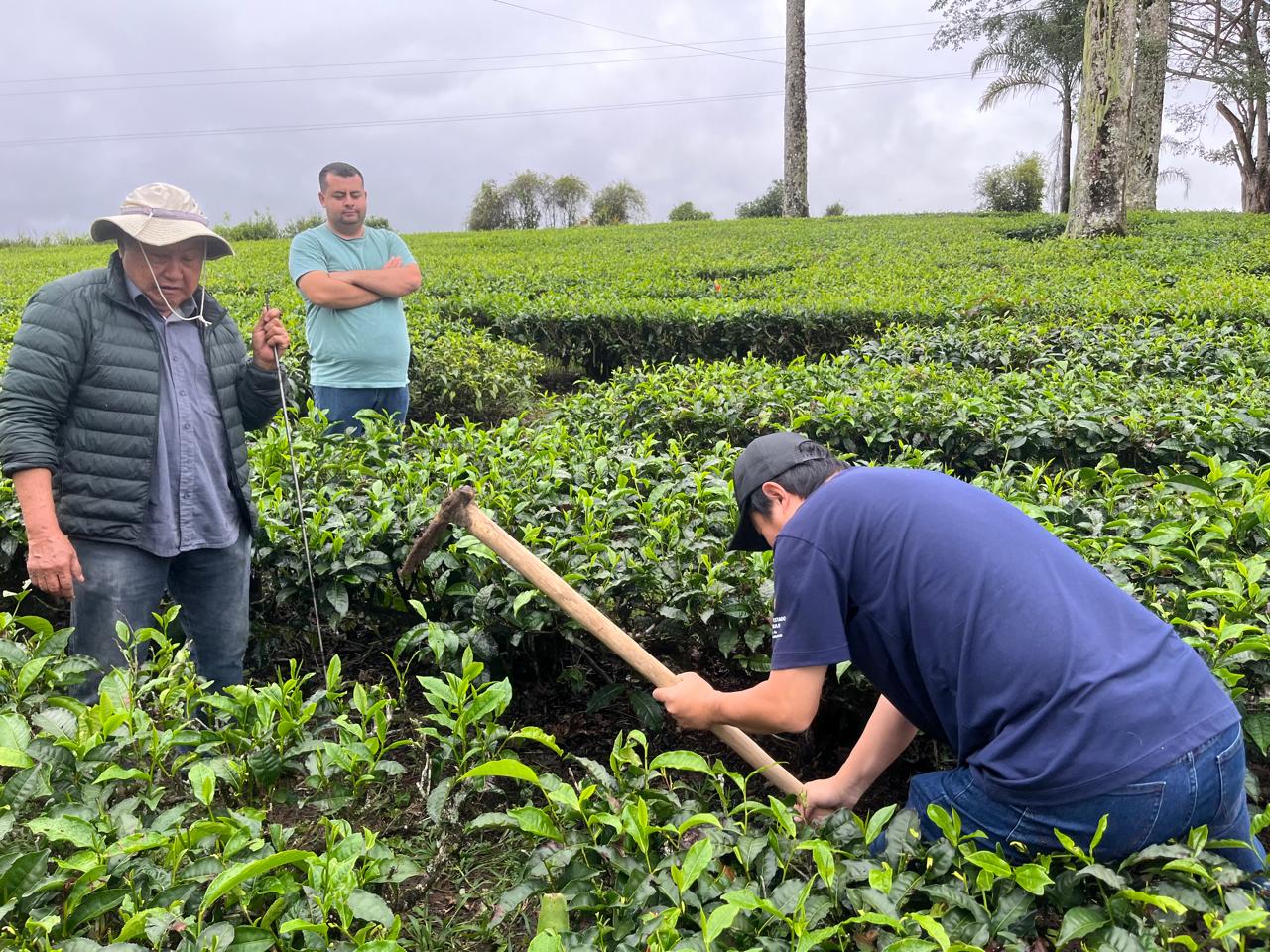 Nas imagens registradas durante a visita, é possível ver o grupo em meio aos cultivos de chá e também durante o trabalho no campo, observando técnicas de preparo da terra e manejo agrícola aplicadas ao longo da atividade.