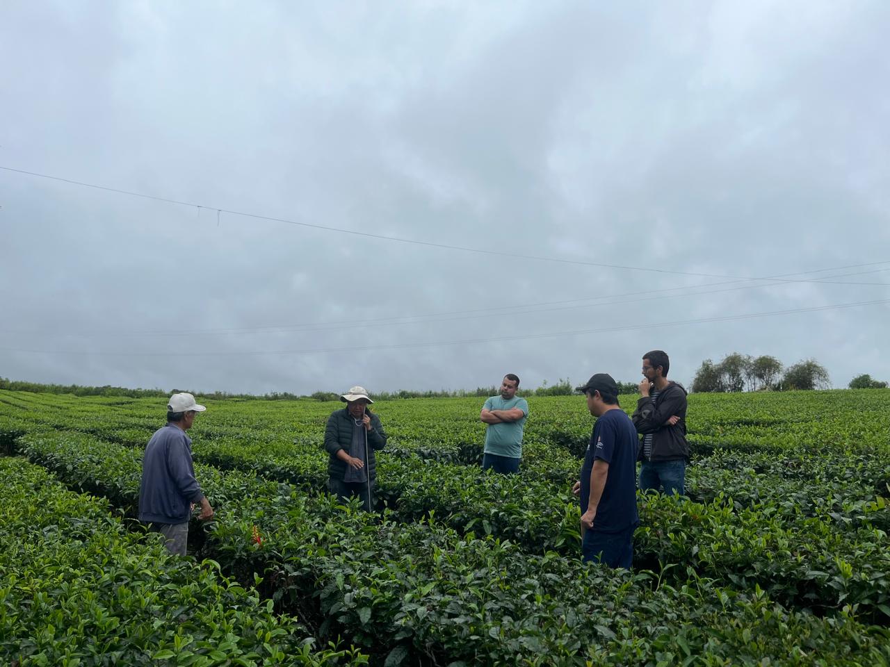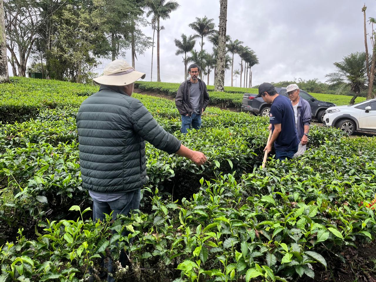 Além do dia de campo no campus, a equipe também participou de uma visita técnica aos chazais da família Amaya, tradicional produtora de chá no Vale do Ribeira há três gerações. O objetivo da visita foi oferecer assessoria especializada sobre manejo, solos e práticas sustentáveis para fortalecer a produção regional.
