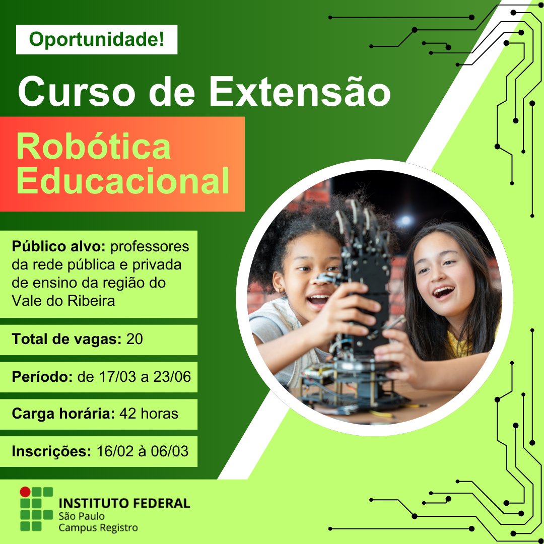 O Instituto Federal de São Paulo – Campus Registro está com inscrições abertas para o Curso de Extensão em Robótica Educacional, conforme o Edital nº 04/2026, publicado em 13 de fevereiro de 2026.