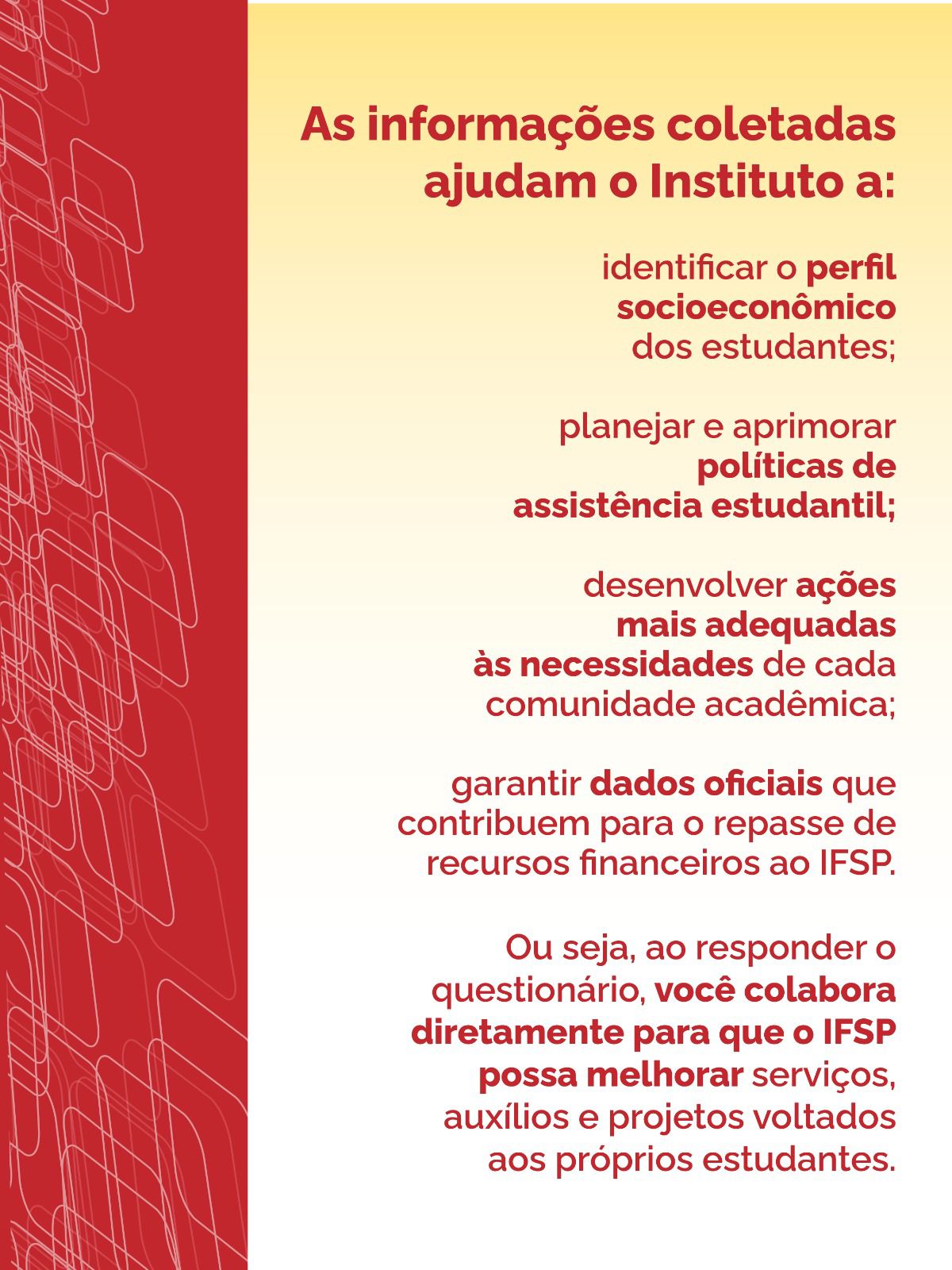 O preenchimento da caracterização socioeconômica é solicitado a todos os estudantes matriculados no IFSP, tanto dos cursos técnicos quanto da graduação e da pós-graduação, inclusive os que não pretendem se inscrever no programa de auxílios.